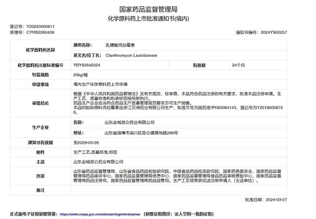 近日,金城醫(yī)藥集團全資子公司山東金城昆侖藥業(yè)有限公司收到國家藥品監(jiān)督管理局下發(fā)的乳糖酸克拉霉素《化學(xué)原料藥上市批準(zhǔn)通知書》。 國家藥品監(jiān)督管理局網(wǎng)站顯示,乳糖酸克拉霉素的相關(guān)劑型為片劑和…