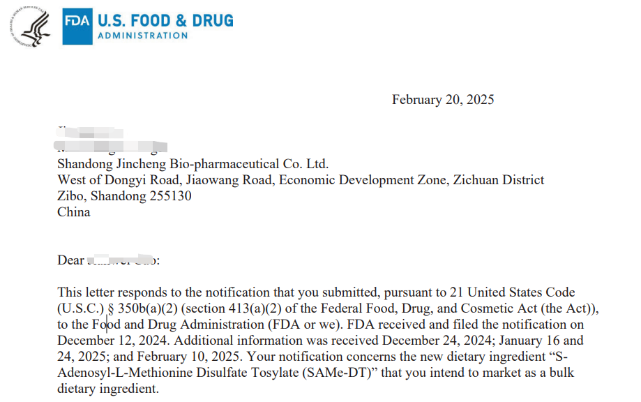 ? ? ? ? 日前,經(jīng)過兩個多月的嚴(yán)格審核,金城醫(yī)藥集團子公司山東金城生物藥業(yè)有限公司(簡稱金城生物)自主研發(fā)的S-腺苷-L-蛋氨酸對甲苯磺酸硫酸鹽(SAMe-DT)順利通過美國食品藥品監(jiān)督管理局(FDA)新膳食成分(NDI)認(rèn)證,F(xiàn)DA正式允許金城生物SAMe作為新膳食營養(yǎng)成分在美國合規(guī)銷售,金城生物成為國內(nèi)首家獲此認(rèn)證的原料生產(chǎn)企業(yè),也是國內(nèi)生物科技企業(yè)在全球功能性成分領(lǐng)域取得的又一重大突破,同時標(biāo)志著金城生物的科研實力與國際合規(guī)能力獲得國際權(quán)威認(rèn)可。